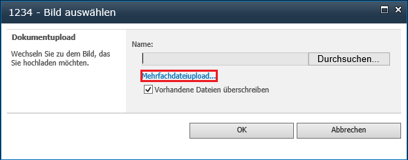 Werden der MS Office Picture Manager und die SharePoint Integration Tools (von Office 2010) neben einer bestehenden Office 2013/2016 Variante installiert, ist der Mehrfachupload über einen Link unter „Hochladen“ möglich.
