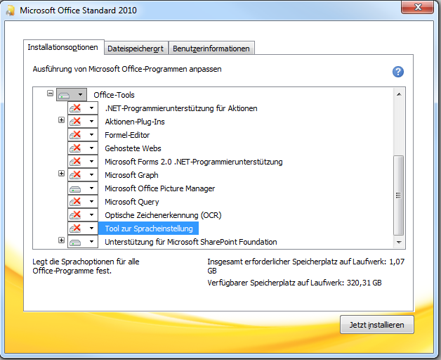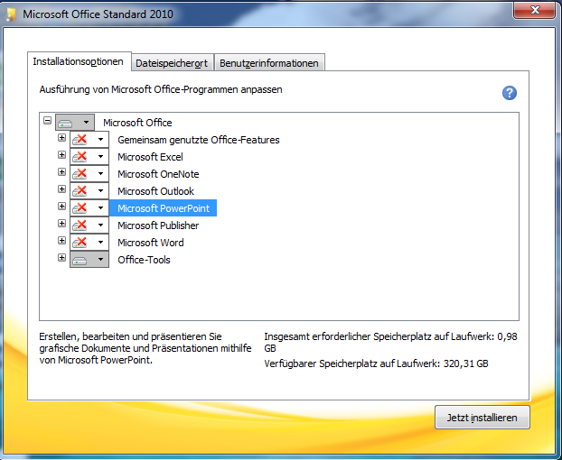 Die nötigen Tools von Office 2010 können Sie während der Installation einzeln auswählen, sodass Sie nicht das komplette Office 2010 installieren müssen:
